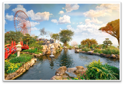 - Japanese Garden: Wander through a peaceful Japanese-style garden featuring red Torii gates, koi ponds, wooden bridges, bonsai trees, and carefully arranged rock landscapes.